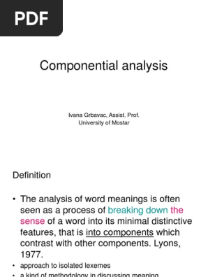 The study of meaning by analysing the different parts of words Definitions on the go Look up any word in the dictionary offline anytime anywhere with the Oxford Advanced Learners Dictionary app. Componential analysis or lexical decomposition is a basic study of lexical fields in determining semantic relation of different lexical items in one lexical field6 Meaning also related with the code of sign its basic idea in definition and analysis of sign. Moreover while many of the benefits of this kind of componential analysis are shared by other approaches a number of problems have been pointed out which are specific to the binary feature approach.